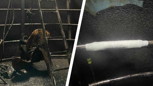 A leaking stainless steel pipe damaged inside a biodigester tank at a pig farm is sealed after an initial repair attempt via patch welding was discovered to have failed