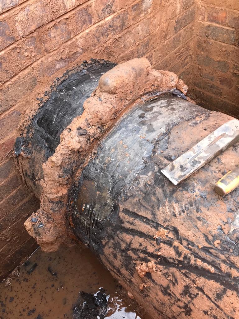 The pit had originally been an inspection chamber housing a valve. Many years ago, the valve had been replaced with a two metre section of straight ductile iron pipe attached to the existing pipe carrying mains water via two coupling joints.