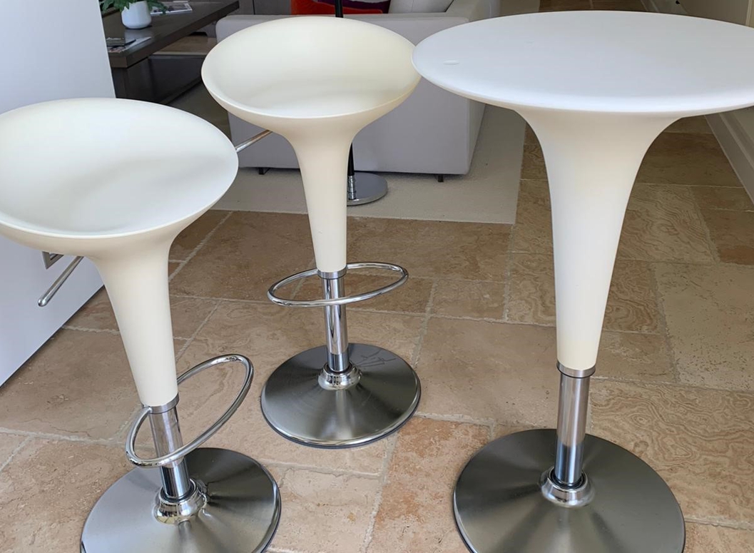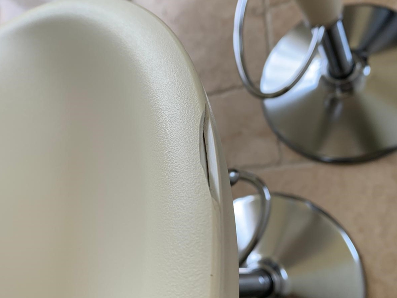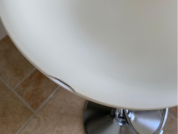 The homeowner had a beloved set of white designer bar stools worth around £500 each. Their children unfortunately knocked one of the stools over whilst playing, causing a large chip to the edge of the seat made from a difficult-to-repair material called SMC.