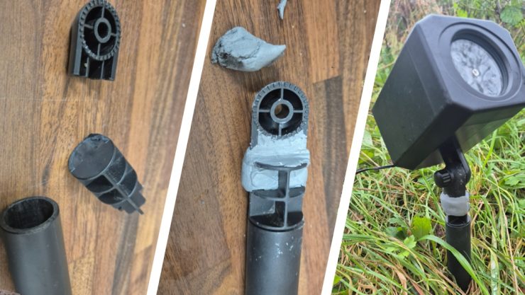 The outer ring was left for one hour to reach a full cure before the fitting was placed back in the spike in the ground. The projector light was then turned back on, leaving the repair to be hailed a success and Christmas saved for the family.
