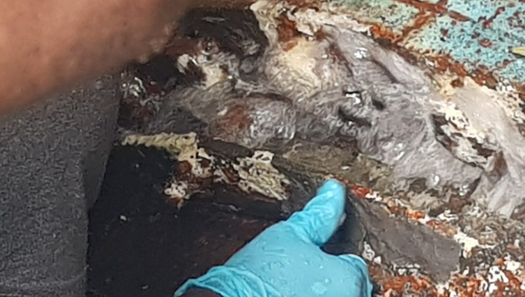 Each stick was kneaded by hand. Whilst soft, the putty was pushed into visible holes in the pipe where it hardened, filling the crack. Superfast Steel was also used to seal the flange and as a means of permanently fixing the rubber plugs in place.