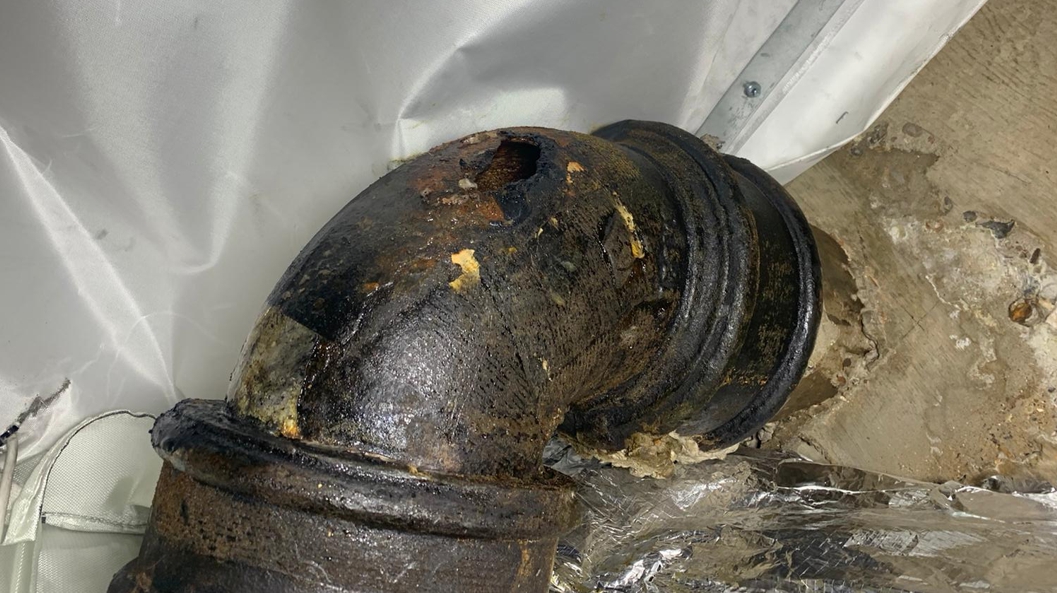 A large crack in a cast iron wastewater pipe required repair in a London Hotel