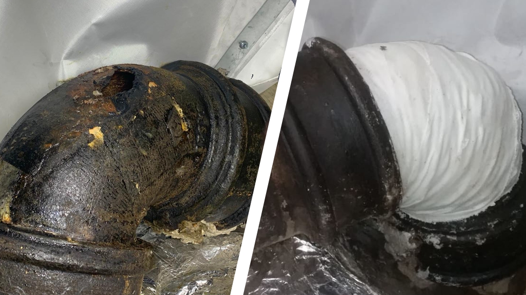 The 50 x 25mm hole therefore required an alternative repair method. To complicate the repair further, the crack in the cast iron wastewater pipe was on an elbow joint.