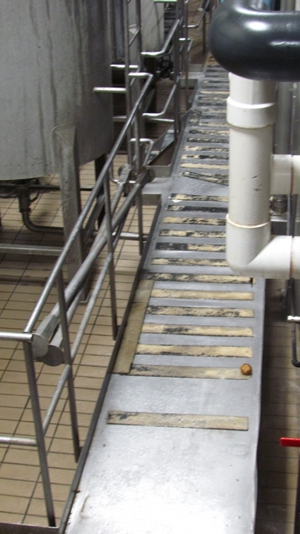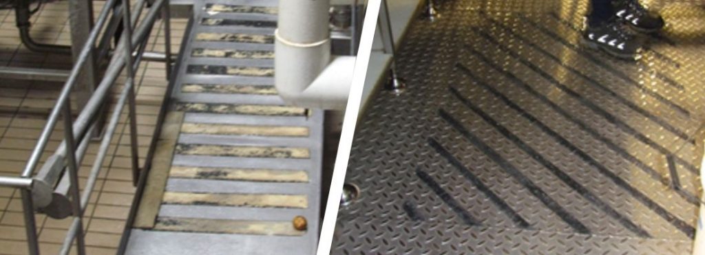 The floor surfaces requiring treatment included the tiled floor of a warehouse, concrete corridors, a metal ramp, stainless steel ladders and staircases, and an open lift used to transport goods between floors.