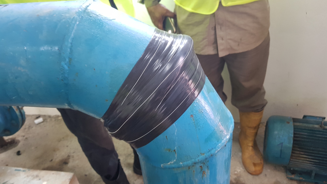 Wrap & Seal Pipe Burst Tape being used to repair a leaking elbow joint at a pumping house in Malaysia