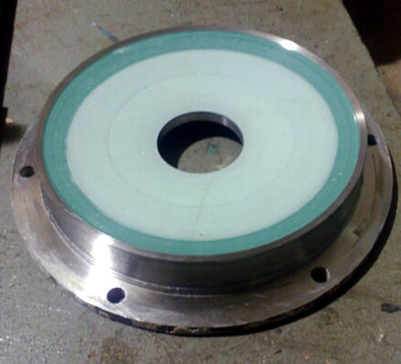 An alloy 20 pump lid having undergone repair using Ceramic Brushable Green Epoxy Coating