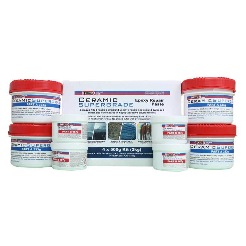 Ceramic Supergrade is filled with silicon carbide for ultimate surface hardness and an extremely smooth finish. It is applied to worn or damaged surfaces to rebuild, or to new equipment to protect parts from abrasion, corrosion and chemical attack.
