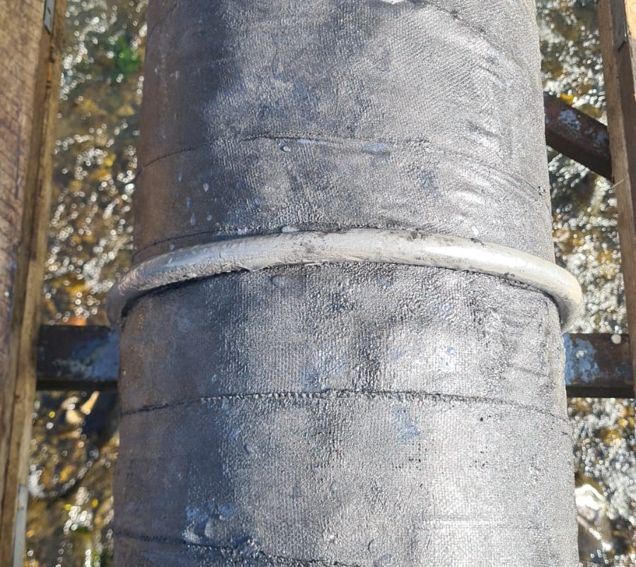 Within minutes, SylWrap CR cured to form a rock-hard, impact resistant shell around the pipe. Arch Services were particularly careful in ensuring that no area of the pipe was left without SylWrap CR. This required precision application close to the steel hoops.